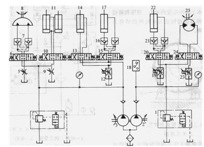 擺動(dòng)缸8是驅(qū)動(dòng)采集爪左右擺動(dòng)的,由電磁閥6來控制,單邊擺動(dòng)角度為135°,擺動(dòng)速度由節(jié)流閥5來調(diào)節(jié)。閥7、16、21為雙向液壓鎖,是使采集爪擺動(dòng)后定位之用的。缸11為采集爪開合缸,由電磁閥10來控制。最大開度為上下兩齒間距0.9m,由節(jié)流閥9來調(diào)節(jié)其開合時(shí)的運(yùn)動(dòng)速度。腕部缸14控制采集爪的俯仰,上下俯仰角可達(dá)90°。小臂缸17由電磁閥15來控制。由于腕部和小臂缸一般不同時(shí)工作,故采用同一電液比例調(diào)速閥12進(jìn)行控制。大臂缸22由電磁閥20來換向,由電液比例調(diào)速閥19進(jìn)行控制。從而構(gòu)成雙泵雙回路的電液比例控制系統(tǒng)。該系統(tǒng)負(fù)責(zé)控制工作中的小臂或大臂與腕部之間的協(xié)調(diào)動(dòng)作?;剞D(zhuǎn)馬達(dá)25通過蝸輪蝸桿和齒輪齒圈減速器驅(qū)動(dòng)回轉(zhuǎn)盤并帶動(dòng)機(jī)械手左右回轉(zhuǎn)。它的工作速度由節(jié)流閥23來調(diào)節(jié),轉(zhuǎn)動(dòng)方向由電磁閥24來控制。壓力繼電器18是對(duì)大臂缸22進(jìn)行過載保護(hù)的,當(dāng)其作業(yè)過程中發(fā)生過載時(shí)即可發(fā)出電信號(hào)使泵卸載。