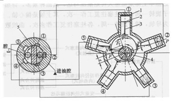 當(dāng)配流軸與曲軸同步旋轉(zhuǎn)轉(zhuǎn)過一個角度后,配流軸“隔離”封閉了油道③,此時缸③與高、低壓腔均不相通,缸①和②通高壓油,使馬達(dá)產(chǎn)生轉(zhuǎn)矩,缸④和⑤排油。由于配流軸隨曲軸一起旋轉(zhuǎn),進(jìn)油腔和排油腔分別依次地與各個柱塞接通,從而保證曲軸連續(xù)旋轉(zhuǎn)。一轉(zhuǎn)中每個柱塞往復(fù)進(jìn)油和排油一次。其他單作用式馬達(dá)的工作原理與此大同小異。