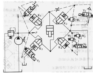 一般而言,由于液壓油缸(廣義而言為任何液壓驅(qū)動的執(zhí)行器)要完成往復(fù)運動,主油路液阻橋路4個橋臂上的4個插裝閥K1、K2、K3、K4是必不可少的。然而,執(zhí)行器往往不只要求簡單的往復(fù)運動,而是有時在某一運動方向上有位置、速度、力運動參數(shù)等方面的要求。這只要在4個橋臂,4個主插裝閥為主的基礎(chǔ)上就可較容易地組成復(fù)合回路。反之,如果有一個復(fù)雜的插裝閥液壓系統(tǒng),一時難以理解,而用液阻橋路的分析方法,就會使系統(tǒng)一目了然。圖4 .12 -12快鍛機液壓系統(tǒng)就是用液阻橋路方法分析四通換向復(fù)合回路的一個例子。